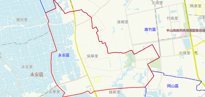 東接路竹區北嶺里、岡山區本洲里 西鄰本區鹽田里、永安里、永華里 南連本區維新里 北至路竹區新達里、後鄉里 |